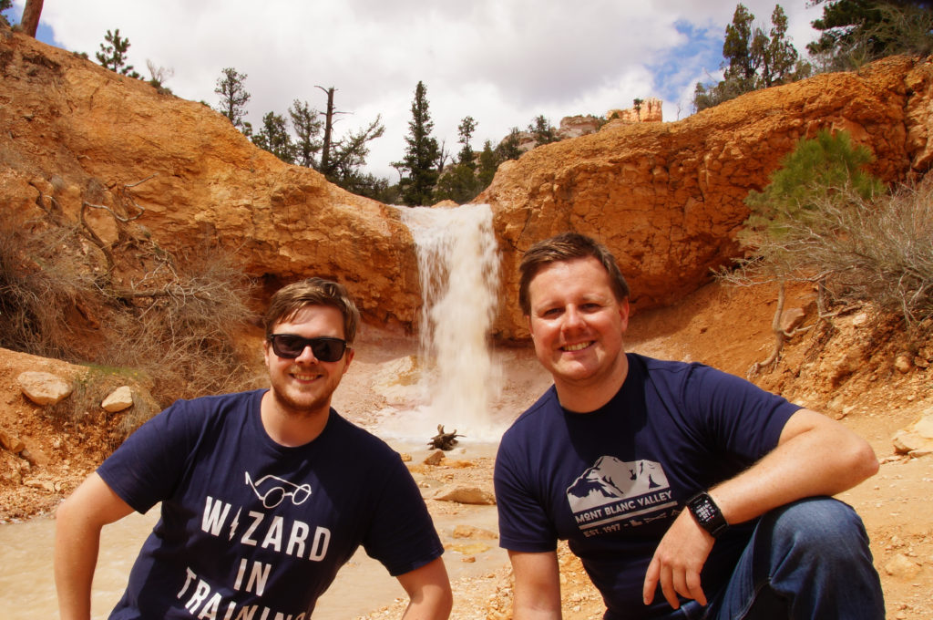 Auf dem Rückweg haben wir dann endlich einen ordentlichen Wasserfall gefunden, den wir bei Regen oder Schneefall schon gestern erwartet hatten. Der Fluss Water Canyon schlängelt sich hier aus dem Bryce Canyon Nationalpark heraus und lässt einen meterhohen Wasserfall entstehen. Da mitlerweile zwar die Sonne herauskam, es aber immer noch sehr kalt war, verzichteten wir auf eine Dusche unter dem Wasserfall.