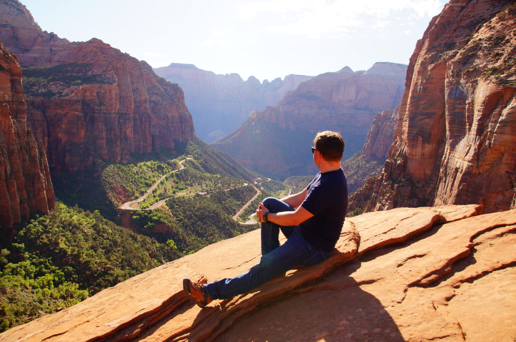 Nun ging es weiter zum Zion Nationalpark, den wir in etwa 2h Autofahrt erreicht hatten. Da wir vom Osten her in den Park kamen, nahmen wir gleich noch den Canyon Overlook Trail mit 1.6 km Länge mit. Dort oben hatten wir eine herrliche Aussicht auf den Zion Nationalpark sowie die Serpentinen, die sich nach dem Tunnel, der den Ostteil des Parks mit dem restlichen Park trennt, den Berg hinunter schlängeln.