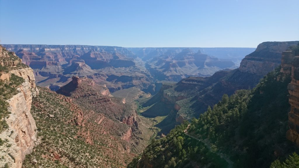 Nun wartete der bisher anstrengendste Teil unseres Urlaubs, der Bright Angel Trail. Insgesamt geht dieser Trail 15,9 km in die Tiefe des Grand Canyons bis hin zur Phantom Ranch. Doch dies wäre nur mit einer Zwischenübernachtung möglich gewesen, die man weit im voraus anmelden muss.