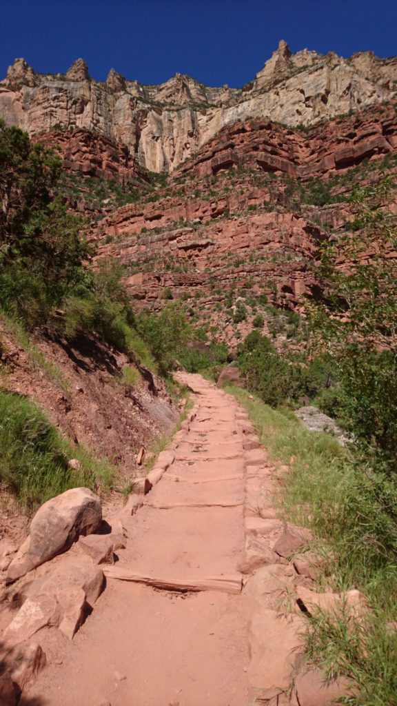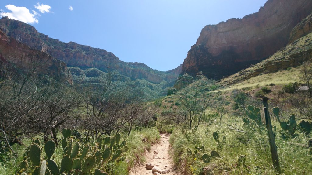 Unser Ziel für heute war Indian Garden. Mit 7.7 km und ca. 1000 Höhenmetern (also insgesamt 15.4 km und 2000 Höhenmeter) genug für einen Tag. Mit genug zu Trinken und guter Laune ging es im Eiltempo bergab, ja richtig, im Grand Canyon geht es erst bergab und am Ende erst wieder bergauf. Schnell hatten wir das One-and-a-half Mile Resthouse sowie das Three Mile Resthouse erreicht.